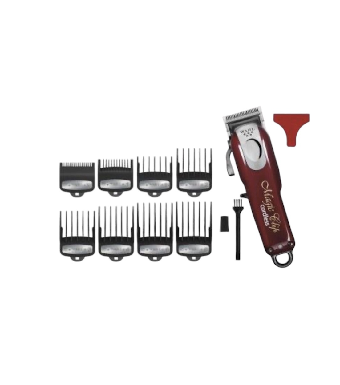 El KIT incluye: 8 peines Premium del número 1½, 3 mm, 4½ mm, 6 mm, 10 mm, 13 mm, 19 mm, 25 mm, un cepillo de limpieza, una botellita de aceite, peine de seguridad para la cuchilla y un cargador.