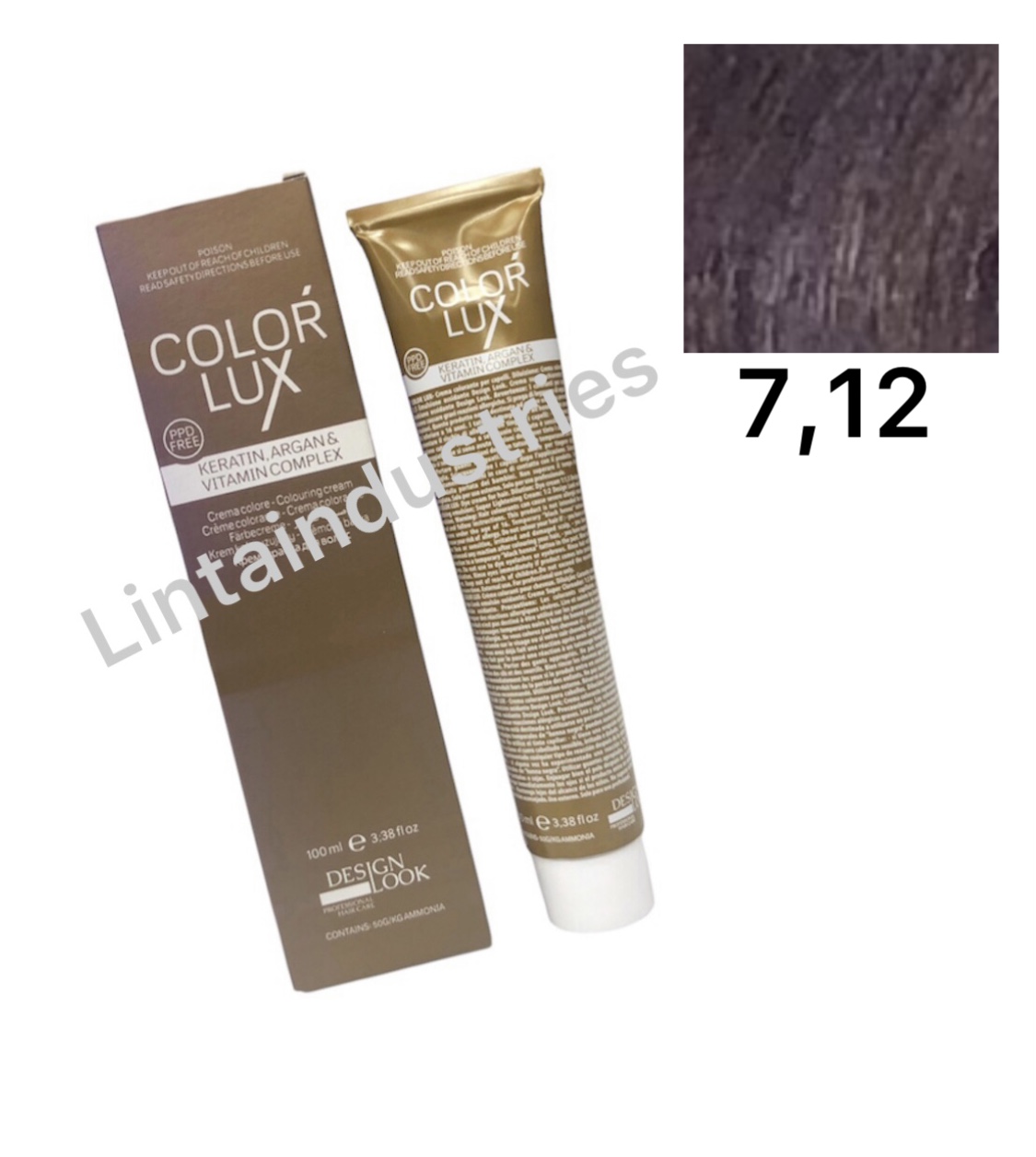 TINTE COLOR LUX 100ML (7,12) con argán y keratina de Desing Look protege el cabello durante y después del proceso técnico. La fórmula de esta tintura deja el cabello suave y brillante sin dañarlo durante el proceso. Disponible en varios tonos y correctores.