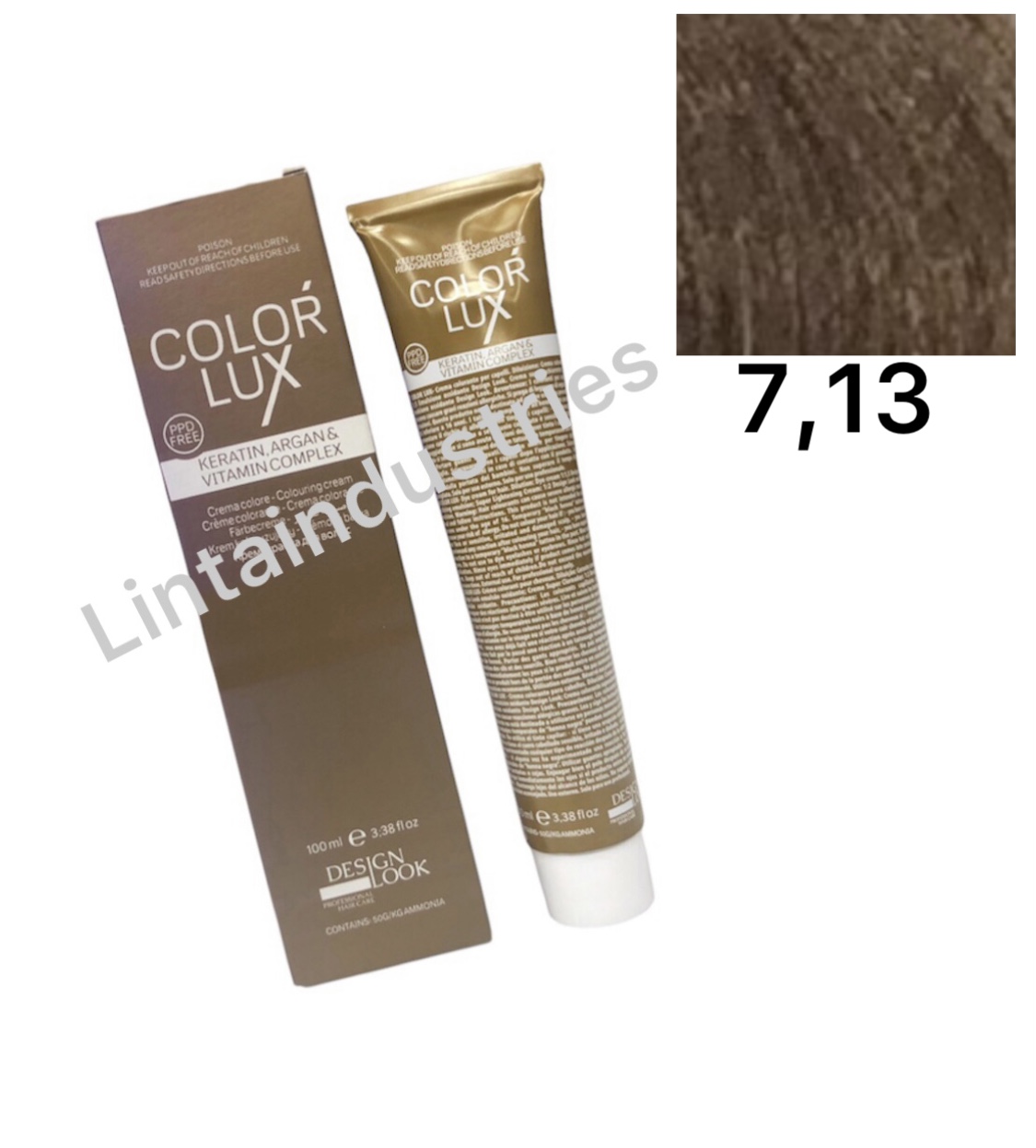 TINTE COLOR LUX 100ML (7,13) con argán y keratina de Desing Look protege el cabello durante y después del proceso técnico. La fórmula de esta tintura deja el cabello suave y brillante sin dañarlo durante el proceso. Disponible en varios tonos y correctores.
