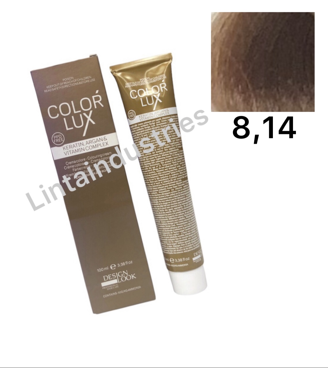 TINTE COLOR LUX 100ML (8.14) con argán y keratina de Desing Look protege el cabello durante y después del proceso técnico. La fórmula de esta tintura deja el cabello suave y brillante sin dañarlo durante el proceso. Disponible en varios tonos y correctores.