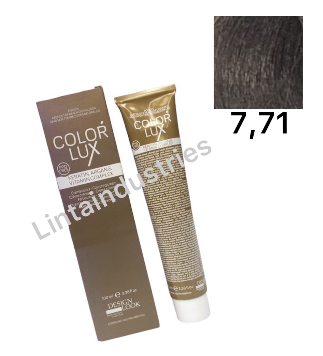 TINTE COLOR LUX 100ML (7.71) con argán y keratina de Desing Lok protege el cabello durante y después del proceso técnico. La fórmula de esta tintura deja el cabello suave y brillante sin dañarlo durante el proceso. Disponible en varios tonos y correctores.