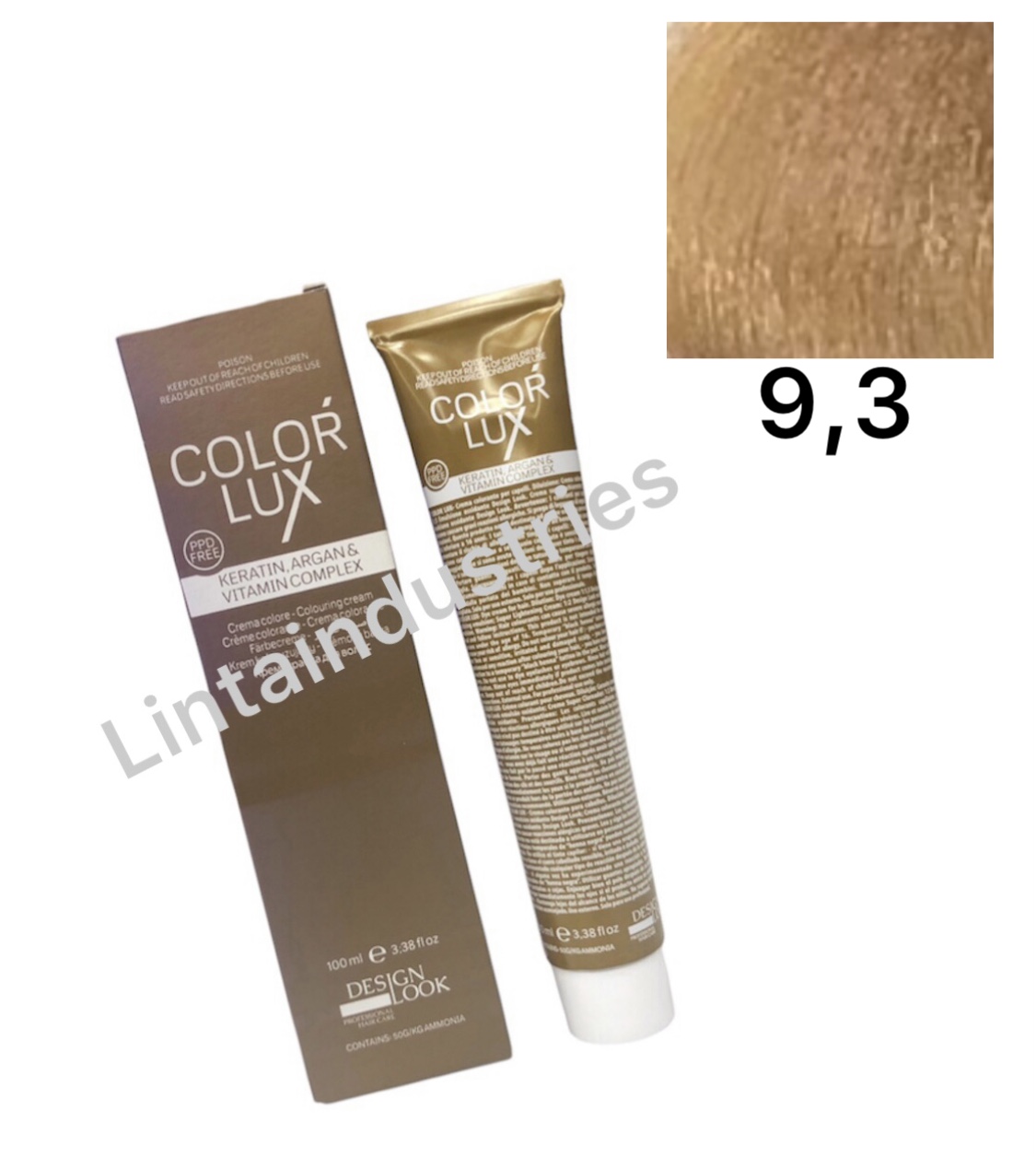 TINTE COLOR LUX 100ML (9.3) con argán y keratina de Desing Lok protege el cabello durante y después del proceso técnico. La fórmula de esta tintura deja el cabello suave y brillante sin dañarlo durante el proceso. Disponible en varios tonos y correctores.