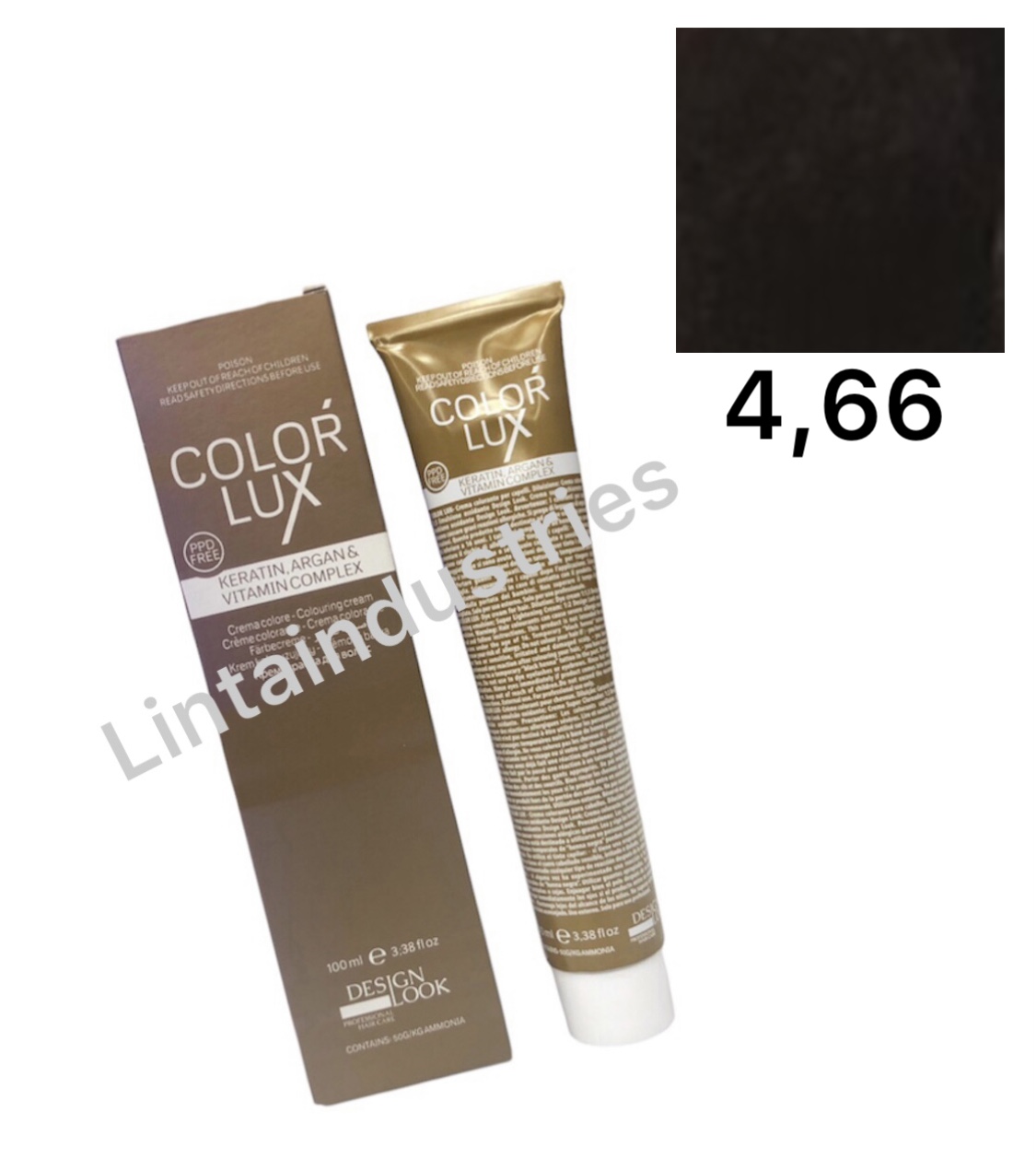 TINTE COLOR LUX 100ML (4.66) con argán y keratina de Desing Lok protege el cabello durante y después del proceso técnico. La fórmula de esta tintura deja el cabello suave y brillante sin dañarlo durante el proceso. Disponible en varios tonos y correctores.