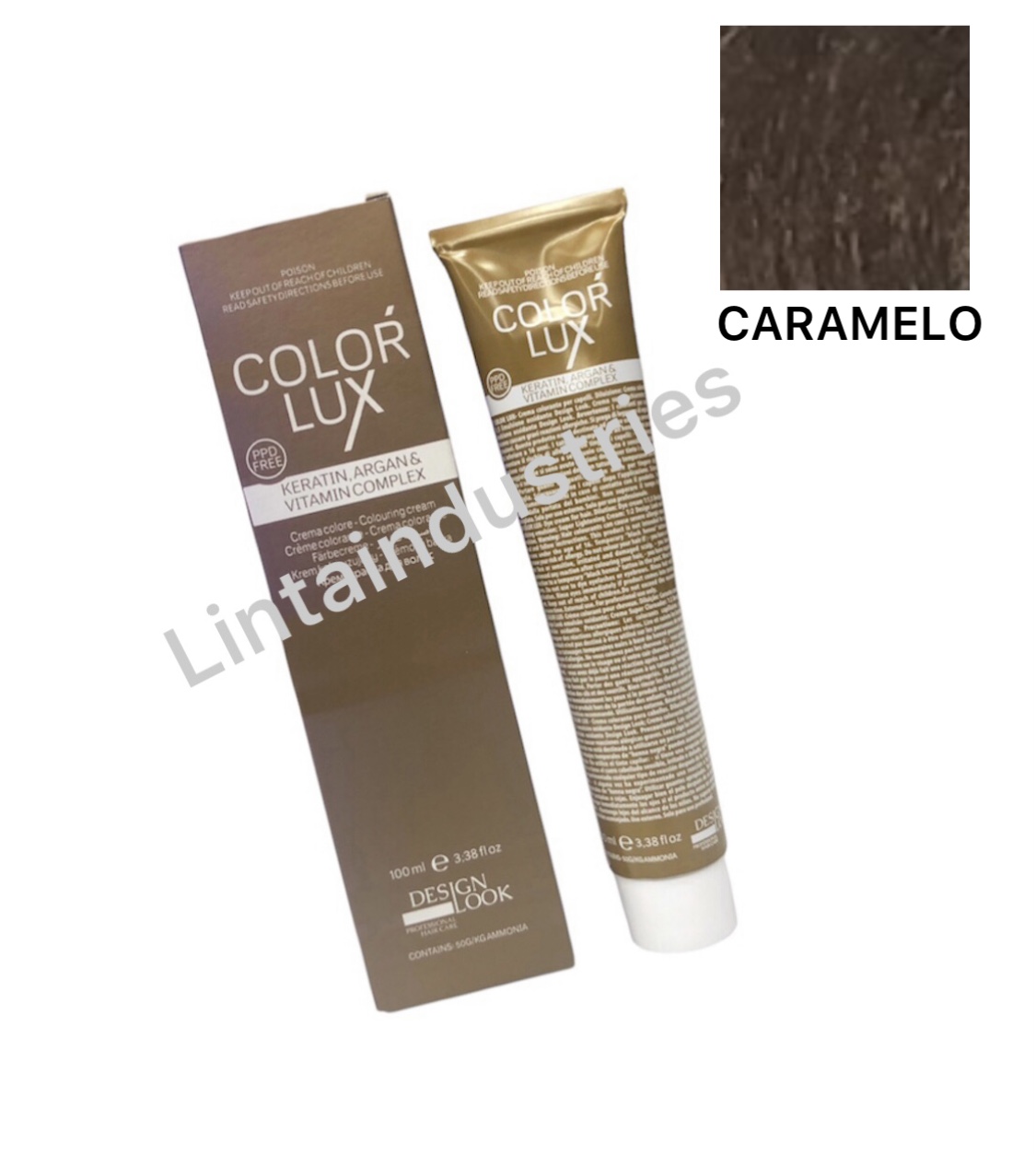 TINTE COLOR LUX 100ML (CARAMELO) con argán y keratina de Desing Lok protege el cabello durante y después del proceso técnico. La fórmula de esta tintura deja el cabello suave y brillante sin dañarlo durante el proceso. Disponible en varios tonos y correctores.