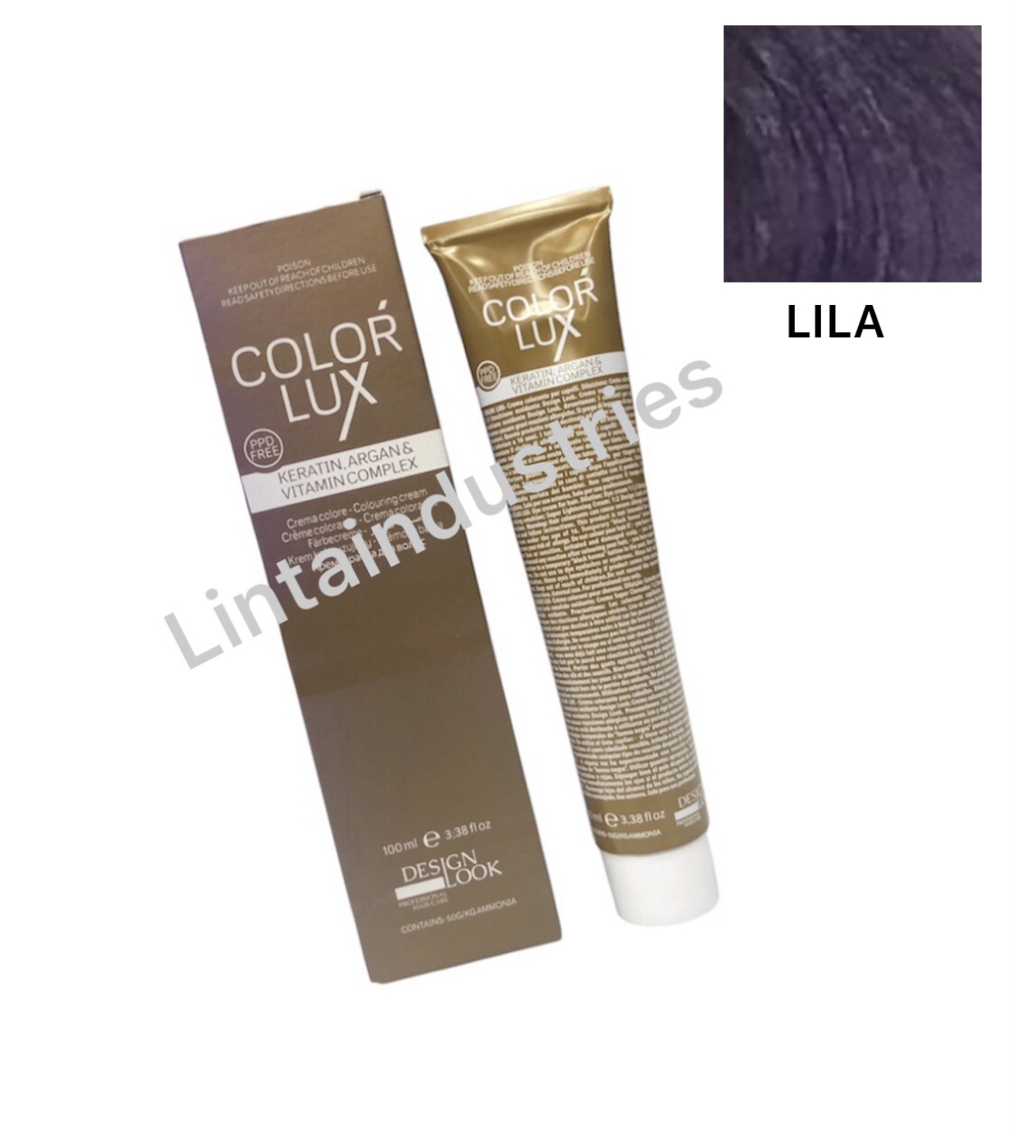 TINTE COLOR LUX 100ML (LILA) con argán y keratina de Desing Lok protege el cabello durante y después del proceso técnico. La fórmula de esta tintura deja el cabello suave y brillante sin dañarlo durante el proceso. Disponible en varios tonos y correctores.