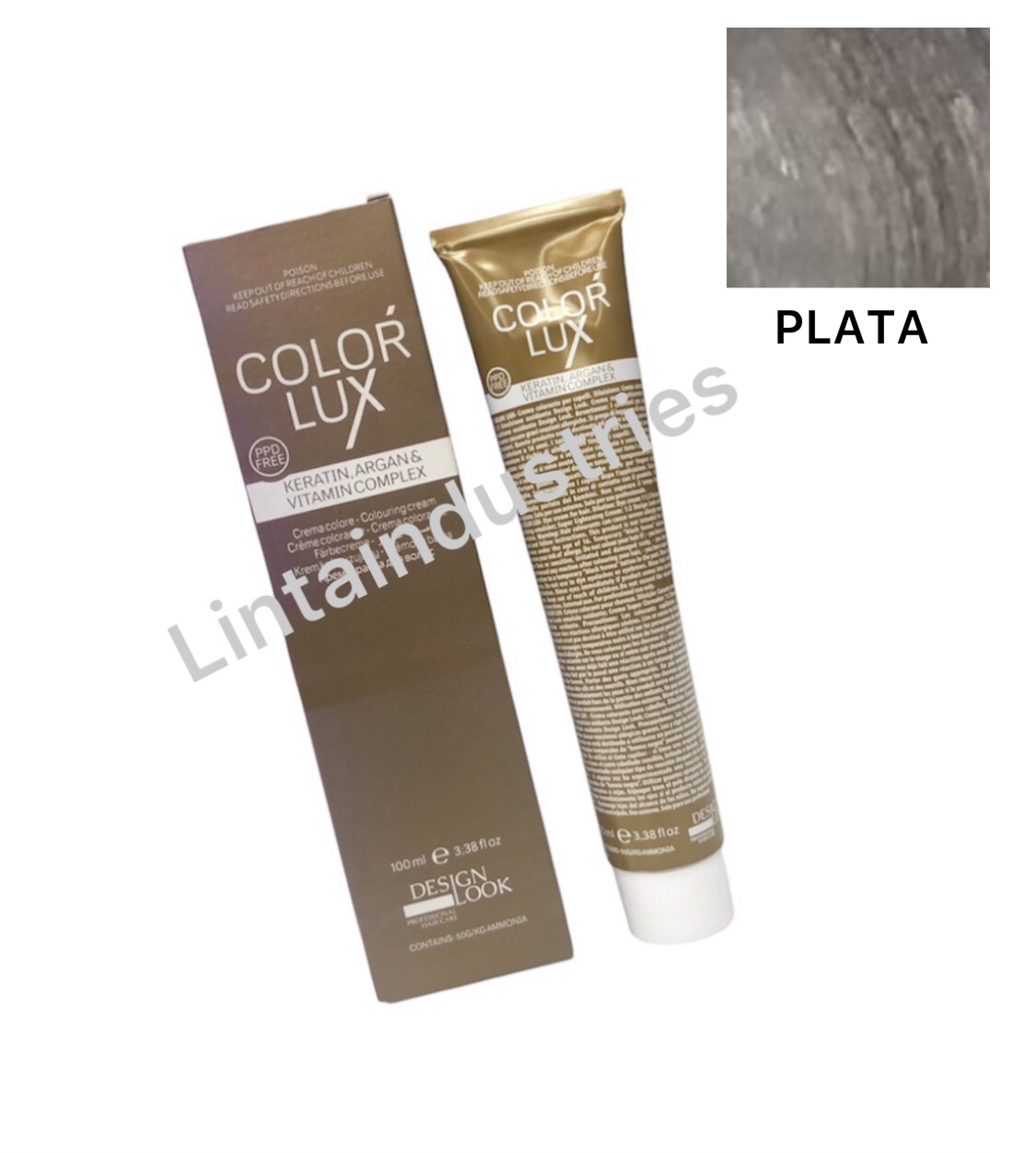 TINTE COLOR LUX 100ML (PLATA ) con argán y keratina de Desing Lok protege el cabello durante y después del proceso técnico. La fórmula de esta tintura deja el cabello suave y brillante sin dañarlo durante el proceso. Disponible en varios tonos y correctores.