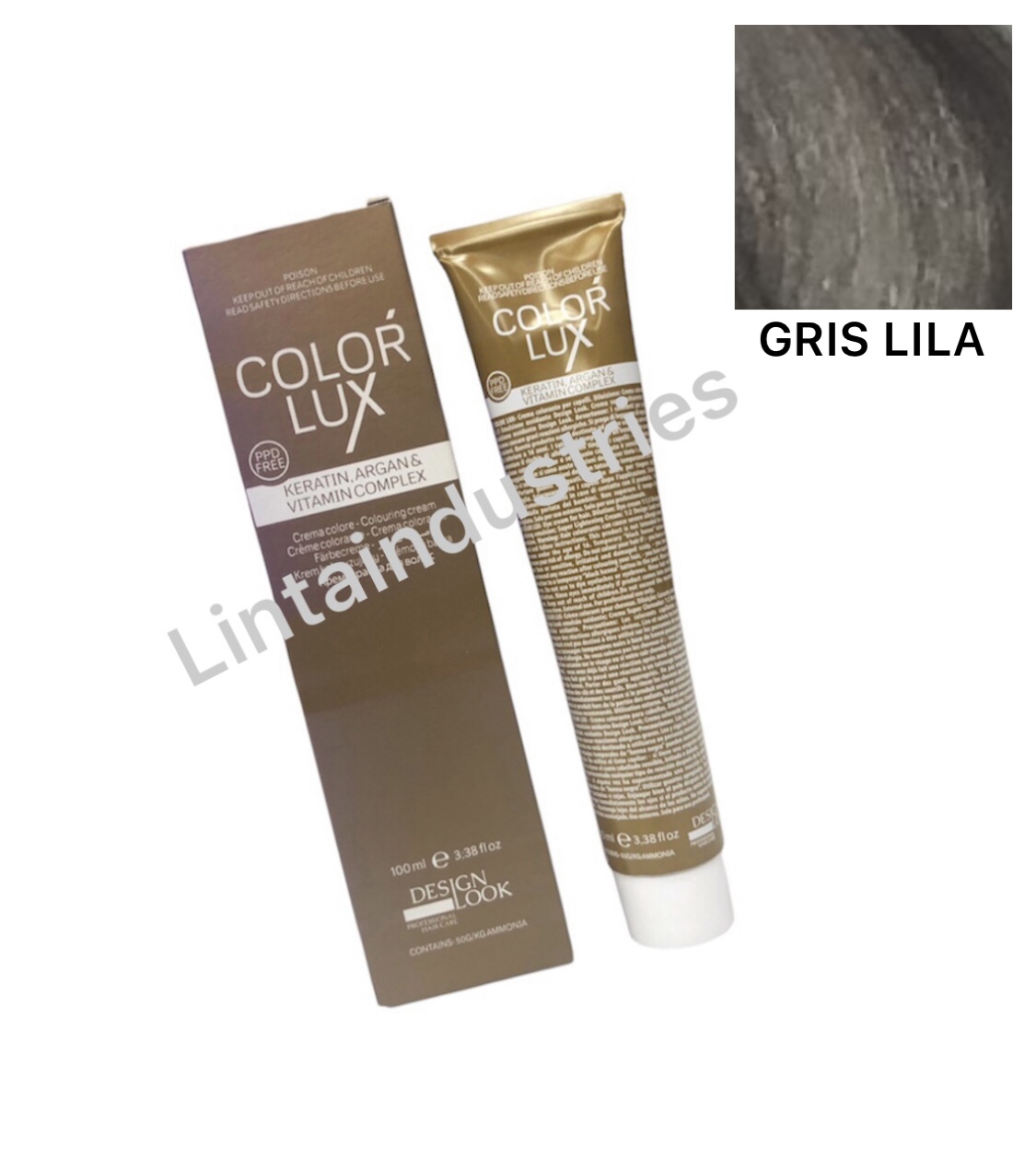 TINTE COLOR LUX 100ML (GRIS LILA ) con argán y keratina de Desing Lok protege el cabello durante y después del proceso técnico. La fórmula de esta tintura deja el cabello suave y brillante sin dañarlo durante el proceso. Disponible en varios tonos y correctores.