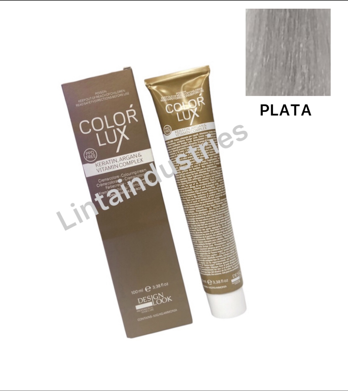 TINTE COLOR LUX 100ML(PLATA ) con argán y keratina de Desing Look protege el cabello durante y después del proceso técnico. La fórmula de esta tintura deja el cabello suave y brillante sin dañarlo durante el proceso. Disponible en varios tonos y correctores.