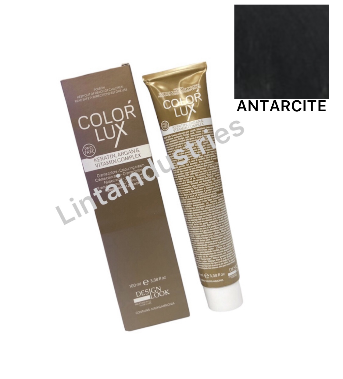 TINTE COLOR LUX 100ML(ANTARCITE) con argán y keratina de Desing Look protege el cabello durante y después del proceso técnico. La fórmula de esta tintura deja el cabello suave y brillante sin dañarlo durante el proceso. Disponible en varios tonos y correctores.